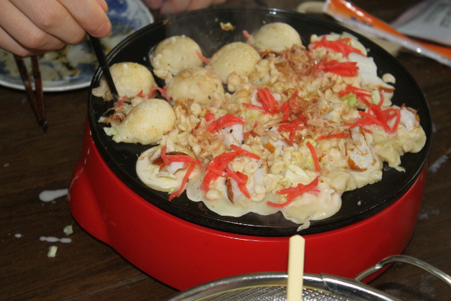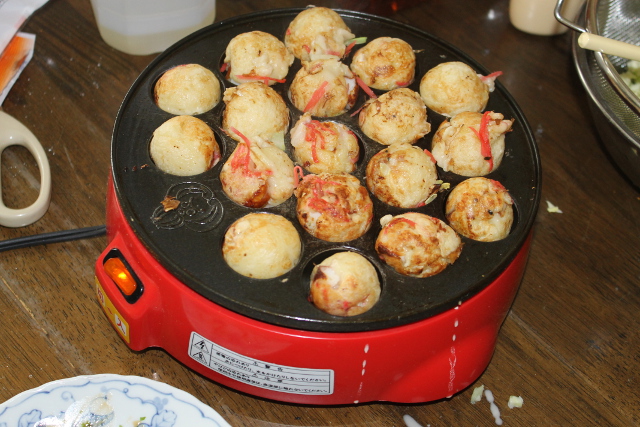 1回(かい)で18個(こ)のたこ焼(や)きが焼(や)けるので2回半(かいはん)焼(や)いたので一人(ひとり)24~5個(こ)食(た)べました。