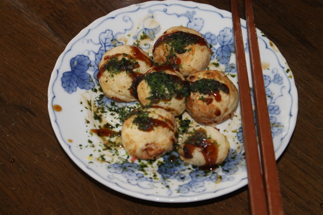 すごくいいお天気(てんき)でしたが、お昼前(ひるまえ)からBSでヤンキースとエンゼルスの試合(しあい)を見(み)ながら、息子(むすこ)とたこ焼(や)きを焼(や)きました。たこの代(か)わりにちょっと値(ね)が張(は)った上等(じょうとう)のちくわを入(い)れてみました。