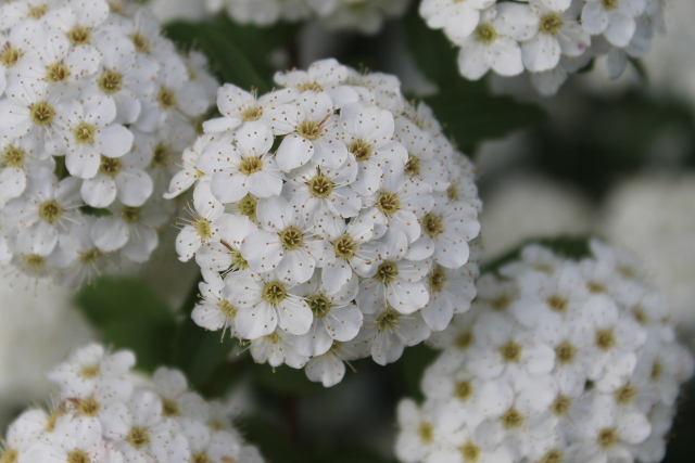 丸(まる)っこい花(はな)に目(め)を向(む)けてみました。小手毬(こでまり)のクローズアップ写真(しゃしん)です。