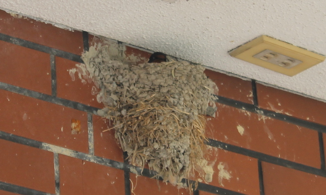 ツバメの巣(す)と親鳥(おやどり)を待(ま)つ雛(ひな)の目(め)が鋭(するど)いです。