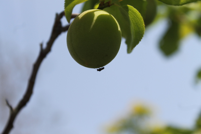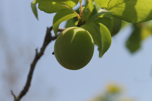 梅(うめ)の実(み)の様子(ようす)を見(み)に行(い)きました。太陽(たいよう)を燦々(さんさん)と浴(あ)びて梅(うめ)の実(み)の曲面(きょくめん)の一(ひと)つ一(ひと)つが輝(かが)いて見(み)えました。