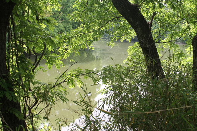 鳥(とり)らしき姿(すがた)は見(み)えず、池(いけ)の周(まわ)りの緑(みどり)が濃(こ)くなっていました。