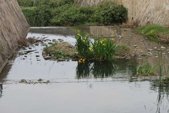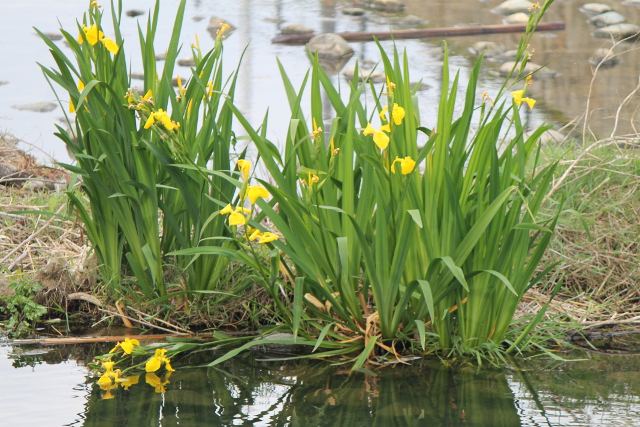千里川(せんりがわ)に咲(さ)くキショウブの花(はな)です。この花(はな)の咲(さ)いている部分(ぶぶん)より一段上(いちだんうえ)のところにあの人面魚(じんめんぎょ)がまだ泳(およ)いでいました。