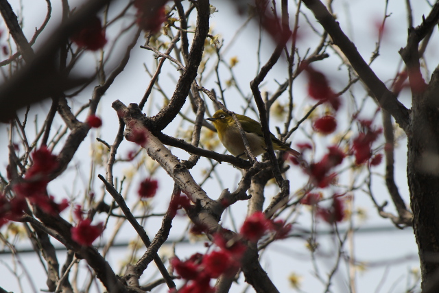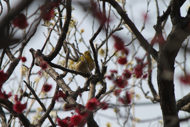 その神社(じんじゃ)に紅梅(こうばい)と白梅(はくばい)が植(う)えられていて、おとなしく咲(さ)いていました。眺(なが)めているとすばしっこい鳥(とり)が飛(と)んできて動(うご)き回(まわ)っていました。カメラのレンズを望遠(ぼうえん)に替(か)えて覗(のぞ)いてみると、なんとウグイスでした。