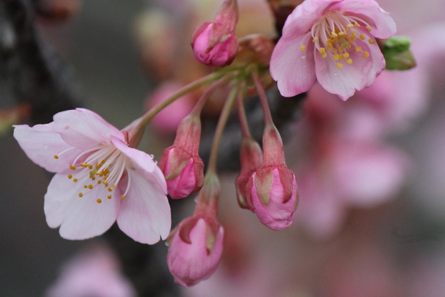 華(はな)やかな河津桜(かわづざくら)の花(はな)の中(なか)でちょこまかちょこまか動(うご)き回(まわ)っていました。