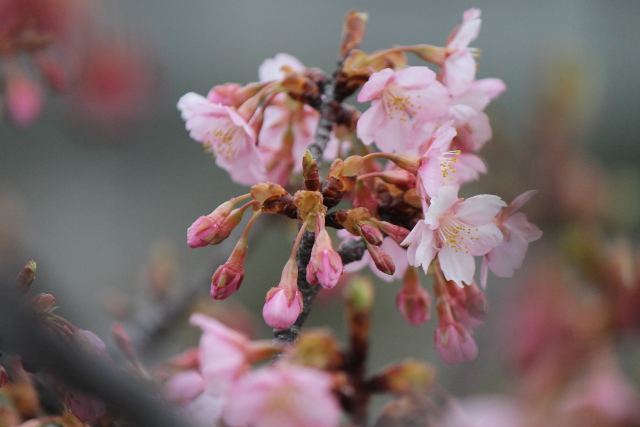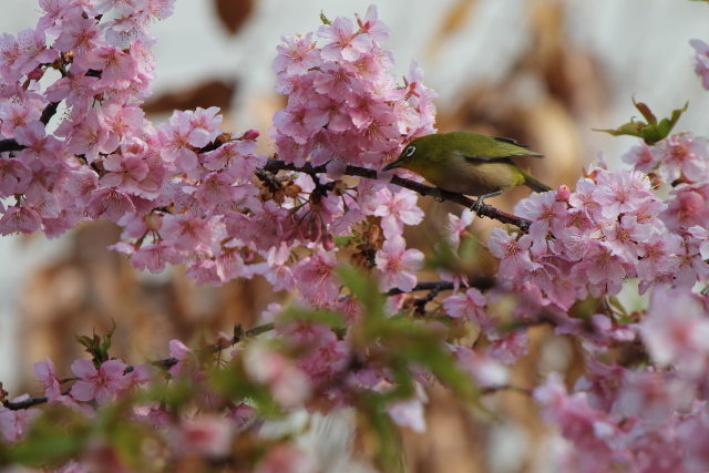 キューズモール箕面(みのお)の萱野広場(かやのひろば)に咲(さ)く河津桜(かわづざくら)です。今朝(けさ)、この桜(さくら)のことを思(おも)い出(だ)して写真(しゃしん)を撮(と)りに行(い)くと、「メジロ」がやってきました。この前(まえ)、梅(うめ)の花(はな)に飛(と)んできたのをウグイスと間違(まちが)えてしまい、ご指摘(してき)を受(う)けました。学習(がくしゅう)しました。ありがとうございました。