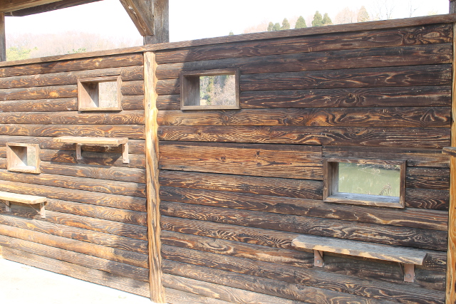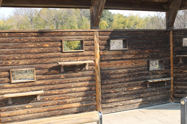 野鳥観察小屋にやってきました。太陽の熱気のせいか、木の壁の付近にもわーっとした暖かい空気が流れていました。春の暖かさです。