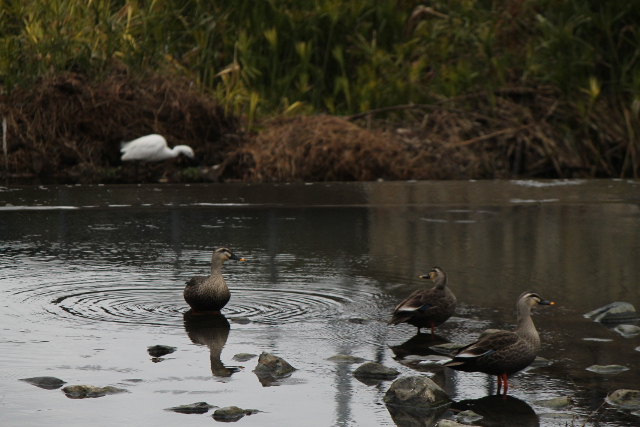 昨日(きのう)の朝(あさ)の千里川(せんりがわ)です。鴨(かも)三羽(さんば)の向(む)こうにくちばしの黒(くろ)いチュウサギが見(み)えています。