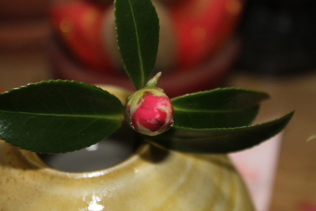 開(ひら)こうと思(おも)った矢先(やさき)に寒(かん)の戻(もど)りがやってきて向(む)こう側(がわ)の赤(あか)い花芽(はなめ)が縮(ちぢ)こまってしまいました。