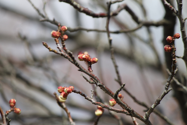 紅(あか)い梅(うめ)はまだつぼみが膨(ふく)らんだ状態(じょうたい)でした。
