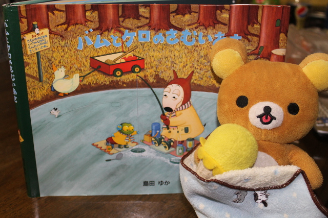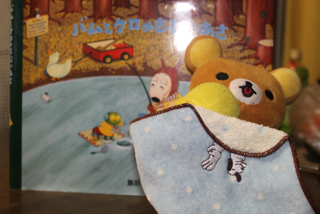 リラックマのブナちゃんも布団(ふとん)にしてみました。小さな犬がヤメピ、三本耳(さんぼんみみ)のウサギみたいのがおじぎちゃんです。