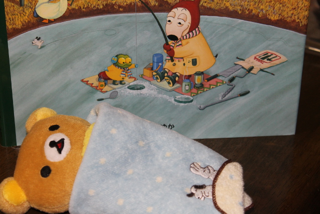 ヤメピとおじぎちゃんがよく見(み)えるように、リラックマののぶくんが布団(ふとん)にして寝(ね)てみました。