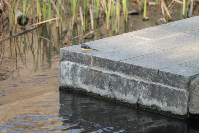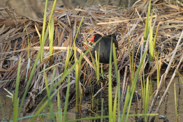 キセキレイの下流(かりゅう)の方(ほう)には蘆(あし)の葉(は)の新芽(しんめ)の中(なか)にバンが歩(ある)いていました。