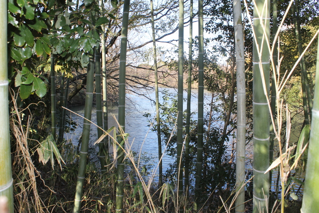 竹(たけ)やぶの方(ほう)から池(いけ)を撮影(さつえい)してみました。右(みぎ)の方(ほう)に青(あお)い竹(たけ)が見(み)えるでしょう。若々(わかわか)しい太(ふと)い竹(たけ)が朝日(あさひ)を浴(あ)びて光(ひか)っています。まだまだ冷(つめ)たい風(かぜ)を受(う)けて池(いけ)の水面(みなも)はざわめいています。
