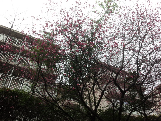 蛍池からの坂を登りきった当たりに梅の花が咲いていました。淡いピンクの花なのですが、灰色の空の下に地味に咲いていました。近づいて一つ一つの花をじっくりと眺めると実に美しい。青い空をバックにするとピンクの花も映えるのでしょうね。