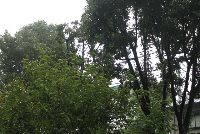 窓(まど)から見(み)える樹木(じゅもく)はそんなに風(かぜ)に揺(ゆ)れることなく静(しず)かに雨(あめ)に濡(ぬ)れています。