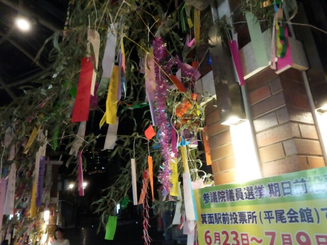 箕面駅前の七夕飾りです。駅を出たところの円窓の柱、4カ所に笹飾りがありました。