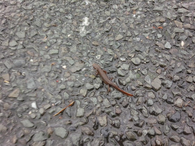 バス停にいたイモリかカナヘビかよくわからない茶色い動物がいました。カナヘビの雌でないかという話です。