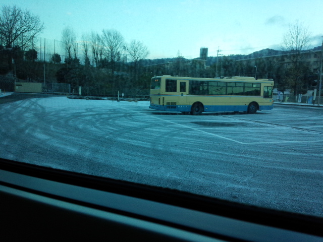 昨夜から降っていた乾いた雪が今朝、道路を白くしていました。我が家からバスターミナルまでいつものクロックスではなくては靴を履いて行きましたが、うすーく積もった雪の方が歩きにくかったです。かなりの冷え込みでいつもより心持ち早めにバスが動いてくれました。
