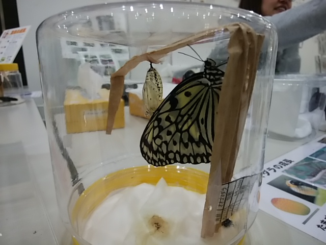 伊丹昆陽イオンで先週もやっていたのですが、昆虫展をしていました。先週撮影できなかった金のさなぎのクリスマスツリーです。オオゴマダラという日本最大級の蝶々のさなぎです。さなぎの数が減っているなと思ったのですが、横を見ると羽化した蝶々が何羽かいました。