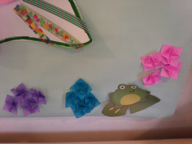 壁飾りのこいのぼりの尻尾の下にカエルと紫陽花が登場しました。