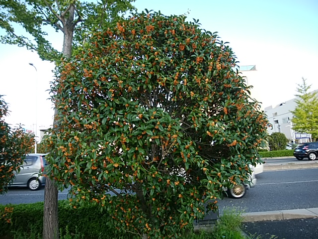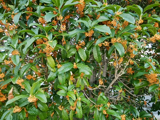 大きな金木犀の木があの独特の香りを発していました。あまり鼻のきかない私が感じるぐらいかなり強い香りだったようです。親子連れが丸い金木犀の木に花をくっつけて香りを楽しんでいました。いやな香りではないということがよくわかる表情でした。