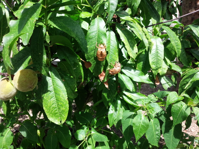 桃(もも)の実(み)がぶら下(さ)がっていたので覗(のぞ)き込(こ)むと蝉(せみ)の抜(ぬ)け殻(がら)があちこちにありました。
