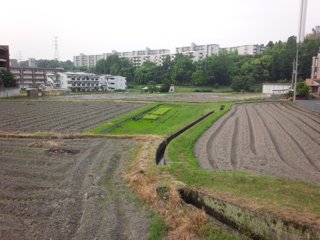 箕面市内の阪急バス、バス停留所宮の前付近の風景です。中央に見える稲の苗がきみどりの四角を作っています。苗代の周りを囲むようにまっすぐの線が引かれた茶色い田んぼが見えています。この茶色い田んぼは『田起こし』をされた状態だそうです。この田んぼに水を入れて平らにならすようにかき回すことを『代かき』というそうです。
