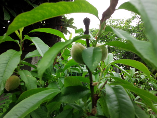 きょうは何かが違うと感じました。それで近づいてよく見れば大きくなった葉っぱの根元に小さな桃の実がいくつか顔を出していました。
