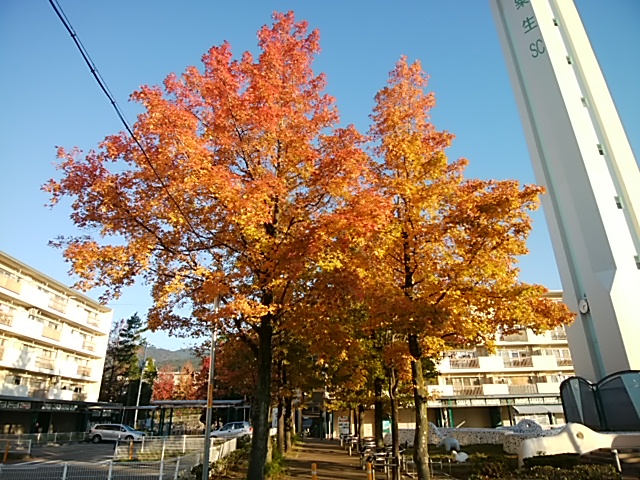 いつもはバス停に向かうのに、この道を通らず右折してしまったからでしょうか、こんなに近くに見事に色づいた黄葉があるとは思いませんでした。
