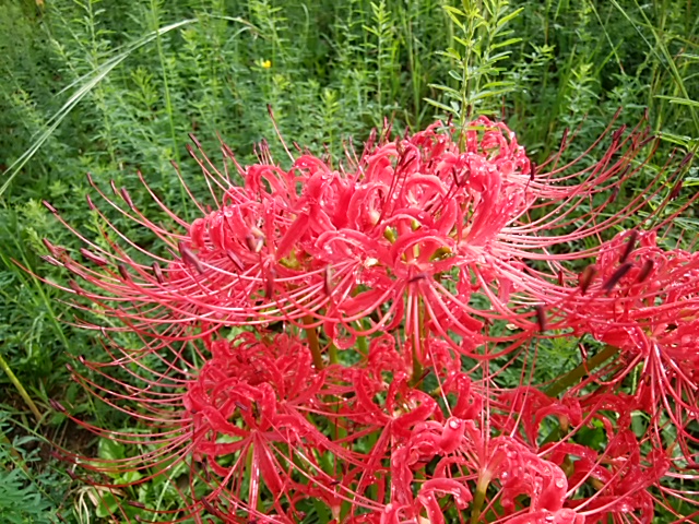 小さな梅の木が周りに植えられている公園のフェンス外の斜面の草原に彼岸花が咲いていました。鮮やかな赤い花が朝の雨に打たれて輝いていました。