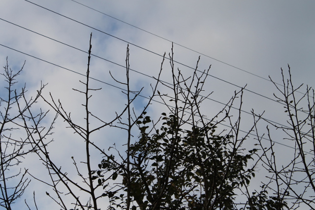 今朝、ベランダから外を眺めると春の光りを感じました。裸木の真っ直ぐ上に伸びた枝のところどころがプクプクとふくれています。葉芽なのでしょうね。縦と斜めの線の向こうにぼんやりとした白い雲と薄青い空が見えました。