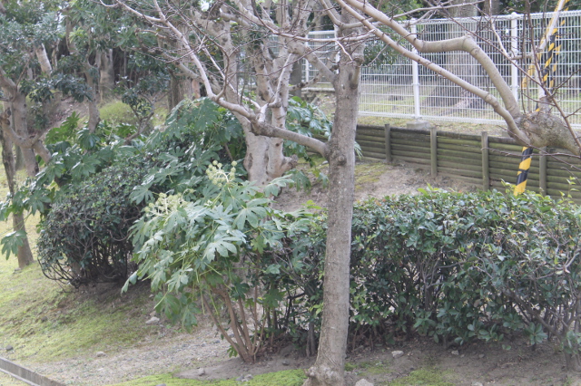 足元にカメラを向けると、ヤツデの葉と白い芽が生き生きと成長しています。その下の地面は土色が減少して緑色に変化していました。