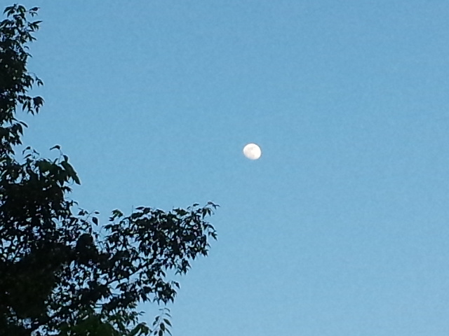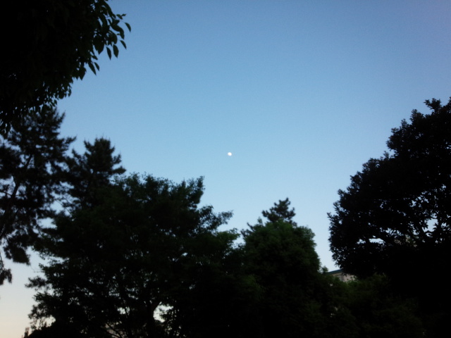 夕方六時半、有明の月が青空に浮かんでいました。