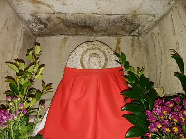 森之宮のUR住宅のはずれにある砲兵工廠跡に建てられているお地蔵様です。雨降りで祠の前に水たまりができていていつものようにチンを鳴らすのが難しかったです。何とか近づいてお堂の前に立つとお地蔵様のやさしい顔を近くに見ることをできました。