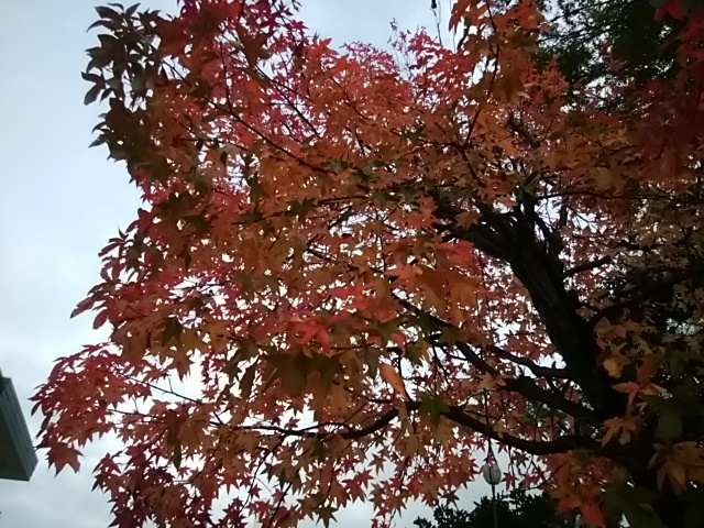 階段の下には真っ赤な大きな葉っぱが濡れて落ちていました。見あげると色づいた葉が緑から赤へとグラデーションしていました。