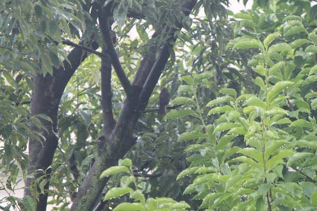 昨日(きのう)、午後(ごご)からの雨(あめ)でふと外(そと)を見(み)ると鳥(とり)が雨宿(あまやど)りをしていました。じっとしていたようで望遠(ぼうえん)レンズに替(か)える間(あいだ)も同(おな)じところに同(おな)じ格好(かっこう)でいました。