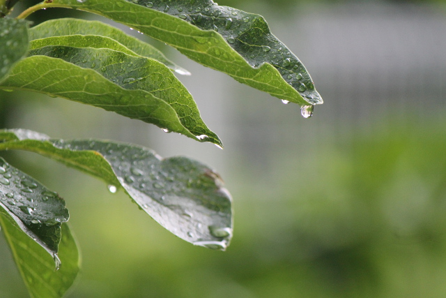木の葉(このは)が雨(あめ)を受(う)け止(と)めるように両端(りょうはし)を上(あ)げています。先(さき)っちょから雫(しずく)になってきらきら落(お)ちていきます。