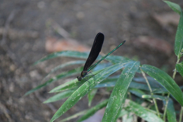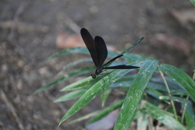 葉っぱに留まってポーズをとると、シャッターの音が聞こえたのかすぐに羽を広げてくれました。胴体が緑に光って美しいトンボでした。羽黒トンボ、別名神様トンボというそうです。