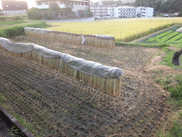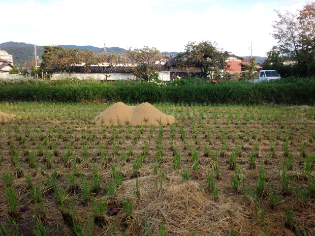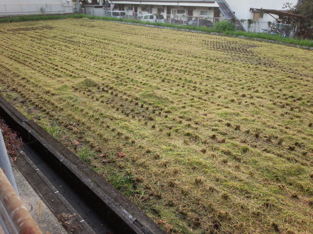 きれいに刈られてスッキリと散髪されていました。ところどころに小さなもみ殻の山が見えています。