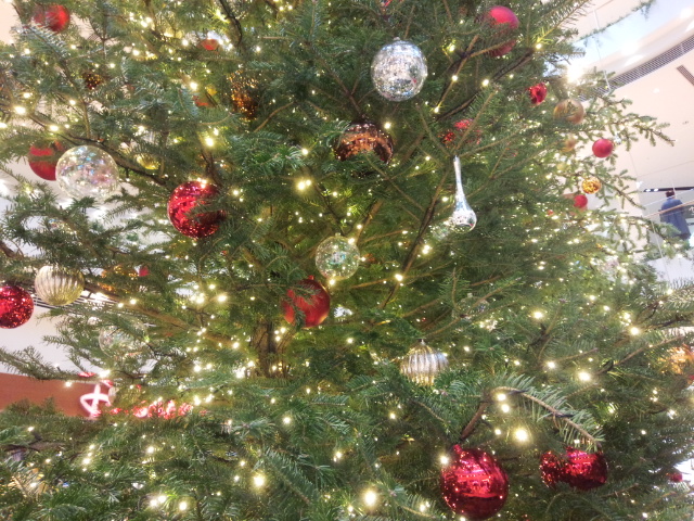 透明のボールがいくつかぶら下がっている大きなクリスマスツリーがエレベーターホール近くの中央部分に見事に立っていました。