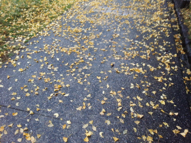 バス停に向かう途中の道で、イチョウの葉っぱが散乱しているのが目に移りました。バスの時間もギリギリだったのですが、帰るころにはきれいに掃除されていることを思い、慌ててスマホで撮影してみました。歩きながらの撮影でちょっとピントがずれてしまったようです。