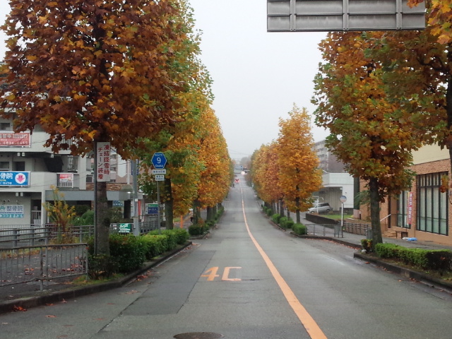 いつものバス停の前の道の街路樹がとても美しく紅葉していたので道路の真ん中に立って西の方向を撮影しました。すぐ後ろに信号機のあるT字路があるので車の音を気にしながらの命がけの撮影でした。まっすぐな道って美しいですね。