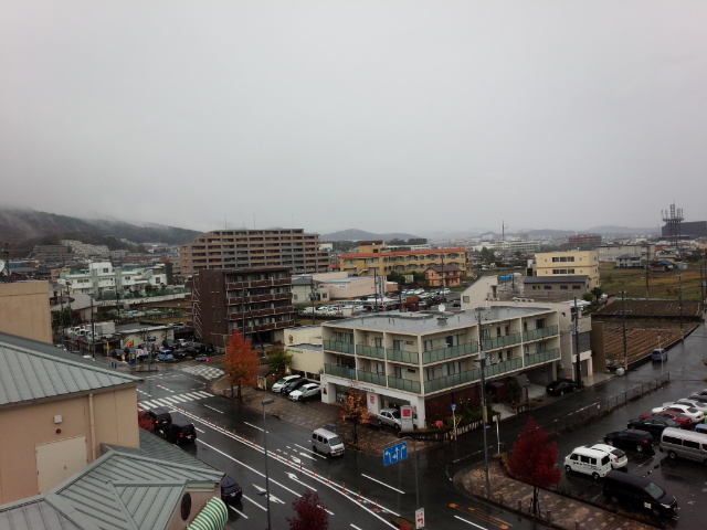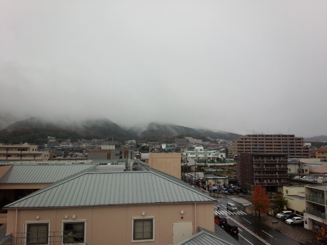 朝からのやや大降りの雨のせいか、白いカーテンが箕面のお山にかかっていました。