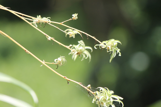 ベランダに置いたオリヅルランの鉢から子苗がするすると伸びて風に揺れていました。