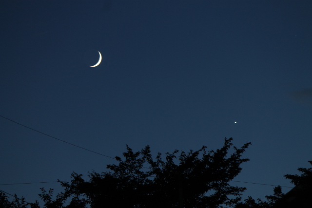 夕方、近くのスーパーに冷やし甘酒を買いに行きました。その帰り、夕焼けの空に白く見えていた爪のような月が空が暗くなるのと共に美しい黄色い姿で光っていました。その横にはキラッと金星が光っていました。急いで家に帰ってカメラを準備して望遠レンズで撮影してみました。