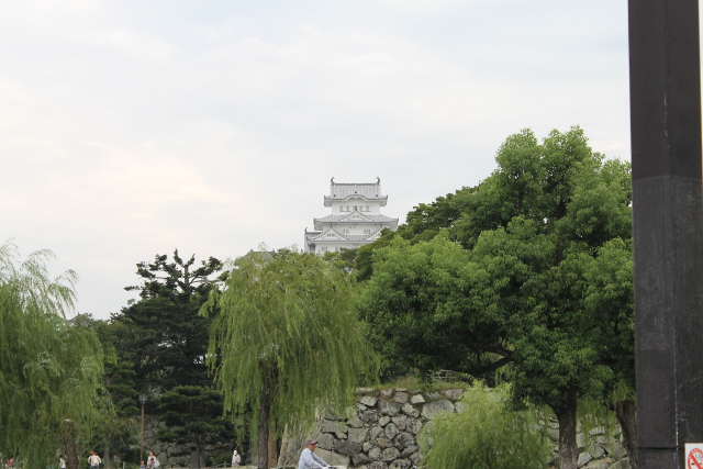 振り向くとお堀の土手の向こうに白く霞むように天守閣が見えました。