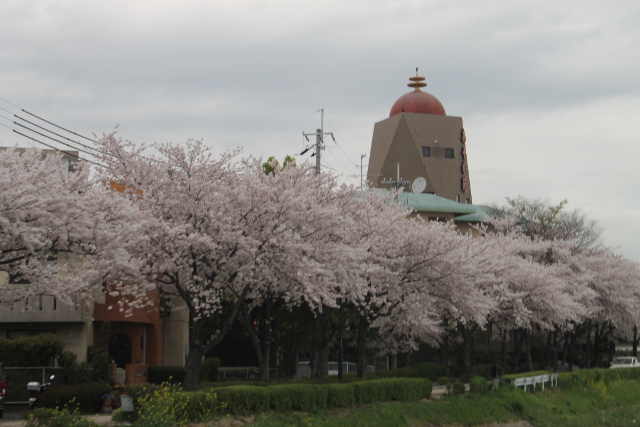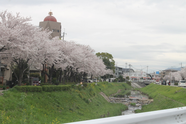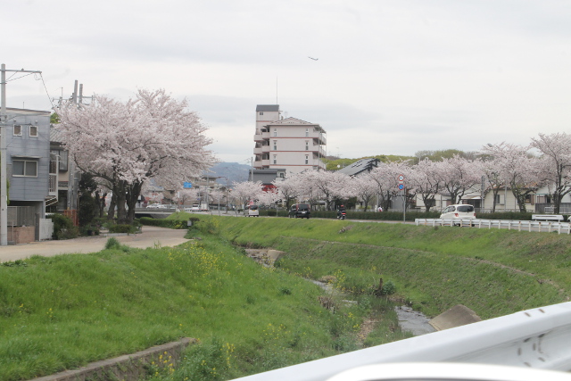 伊丹市の中を流れる天神川沿いの桜並木です。車窓からの撮影なのでちょっと画像が粗くなったかも知れませんが、美しい桜でした。真ん中に飛び上がる飛行機が見えています。