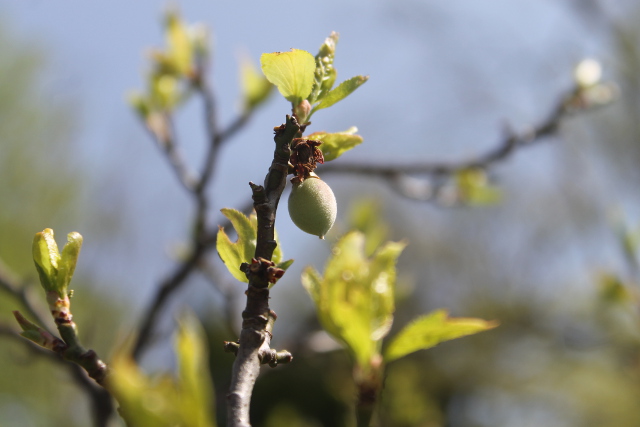 いつもの公園の梅の木に小さな梅の実が付いていました。