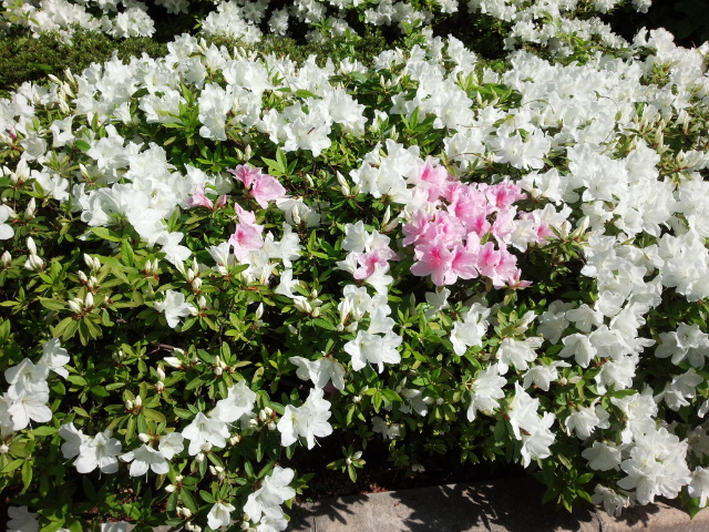 森之宮の病院の植え込みに咲いた白い躑躅(つつじ)です。朝の光を浴びて白い花が真っ白に輝いていました。